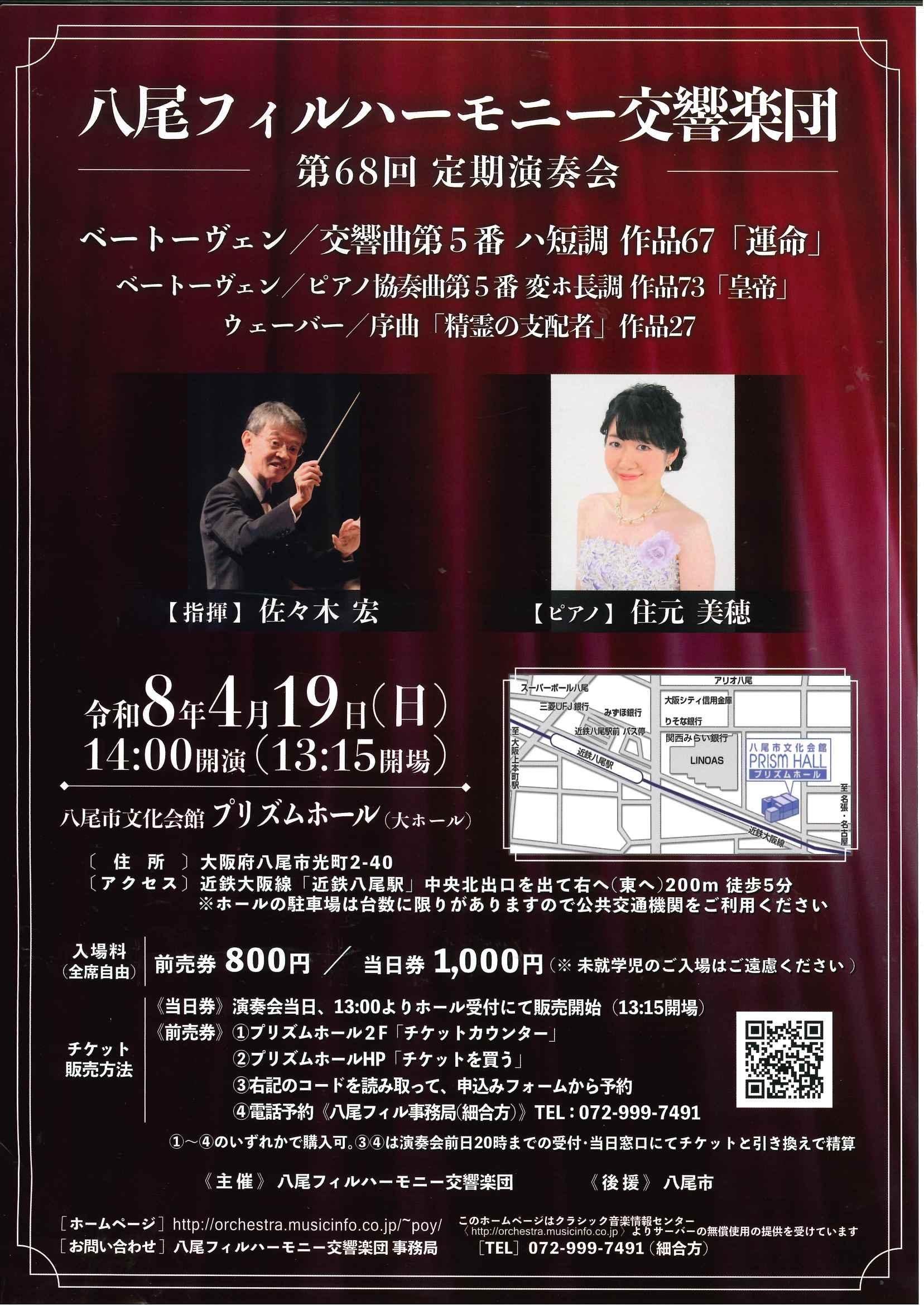 八尾フィルハーモニー交響楽団 第68回定期演奏会 日程:令和8(2026)年4月19日(日) 会場:八尾市文化会館 プリズムホール大ホール 開場:13時15分 開演:14時00分 【チケット】 全席自由 前売 800円 当日1,000円 ※未就学児のご入場はご遠慮ください。 ※プリズムホールウェブサイトでは10日前まで販売。 ※プリズムホールチケットカウンターでは公演前日まで販売。 【お問合せ】八尾フィルハーモニー交響楽団 事務局 072-999-7491(細合方) 【主 催】八尾フィルハーモニー交響楽団 【後 援】八尾市